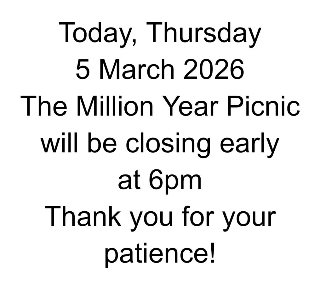 CLOSING EARLY AT 6PM Thursday 3/5/2026 Posted on March 6, 2026 by Kelly Today, Thursday, 5 March 2026, The Million Year Picnic will be closing early at 6pm. Thank you for your patience! Tweet
